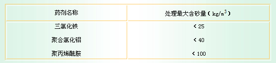 第4.1.1條 單獨投用各種凝聚劑能處理的最大含砂量可按表4.1.1規(guī)定采用。