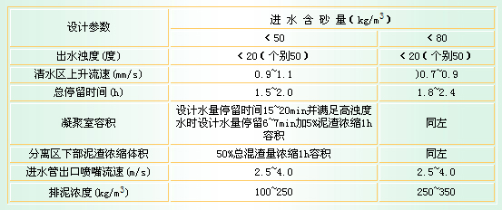 第5.7.1條 水旋澄清池適用于中、小型工程的高濁度水處理構(gòu)筑物。當(dāng)聚丙烯酰胺和普通凝聚劑配合使用時,其進(jìn)水最高含砂量為60~80 kg/m3,出水濁度宜小于20度。