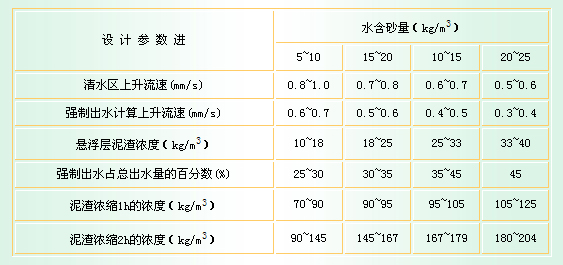 注:表中是使用三氯化鐵凝聚劑時的數(shù)據(jù),若使用硫酸鋁時,上升流速降低一級,泥渣濃度降低10%。