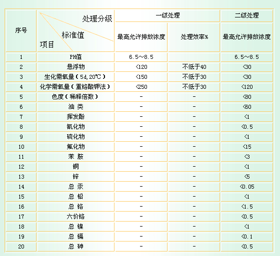 注:1、pH、生化需氧量和化學(xué)需氧量的標(biāo)準(zhǔn)值系指24h定時均量混合水樣的檢測值; 其它項目的標(biāo)準(zhǔn)值為季均值。