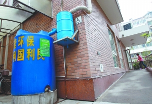 上圖:北新橋街道民安小區(qū)內(nèi)試點安裝了多套雨水收集系統(tǒng)。該系統(tǒng)由排水管道和儲水桶組成,最大儲水量為2噸。下雨時,雨水通過樓面設(shè)置的管道流入儲水桶,經(jīng)內(nèi)置的過濾系統(tǒng)將雜質(zhì)過濾。使用時只需擰開儲水桶下方的水龍頭,就能利用過濾后的雨水沖洗路面、灌溉小區(qū)內(nèi)的綠地。